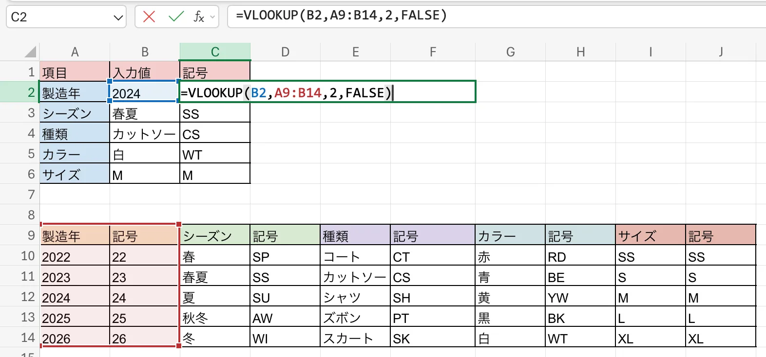 次に、先ほど作成したマスタ表から、VLOOKUP関数を使って項目名に対応する記号を引っ張ってきます。