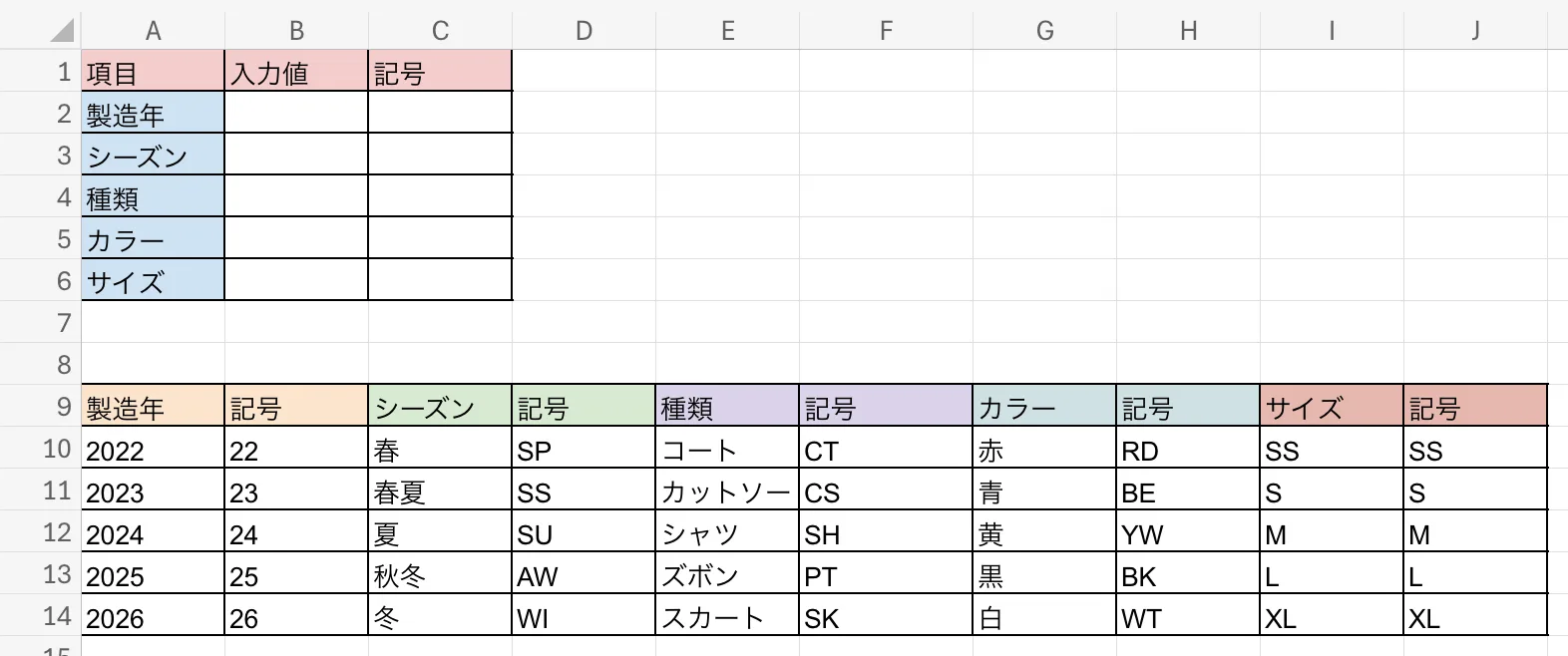 例えば、「製造年」「シーズン」「アイテム種別」「カラー」「サイズ」など、どの項目を作ればすべての商品を識別できるか整理しましょう。
