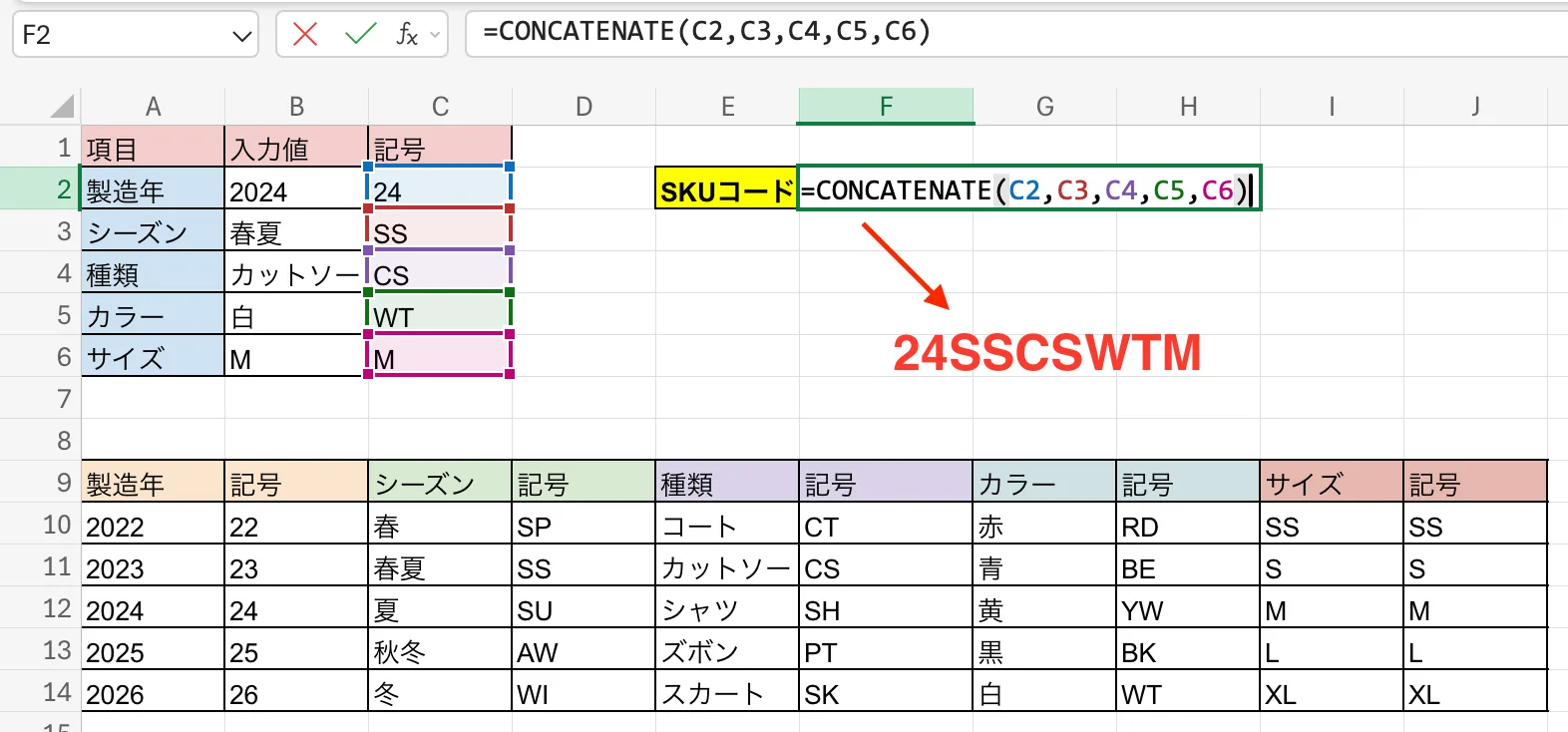 先ほどの例だと「24SSCSWTM」のようになり、SKUコードが完成します。
