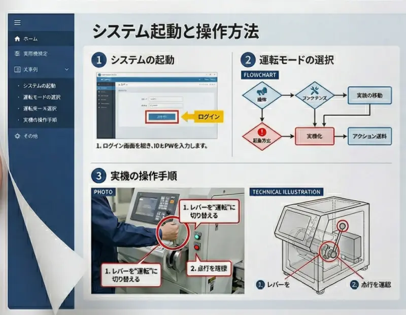 そこで、現品の写真や操作画面のキャプチャを豊富に盛り込んだマニュアルを作成しましょう。