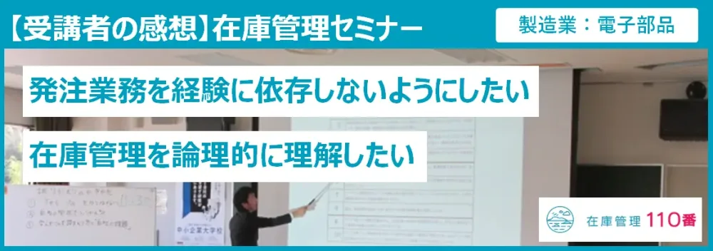 在庫管理セミナー受講者の感想(製造業:園芸資材) 2026/01/07 (最終更新日:2025/12/03) 在庫管理110番が定期開催している在庫管理セミナーの受講者の感想をご紹介します。 受講いただいたセミナーは、「適正在庫の決め方と在庫管理の仕組みづくり」です。 受講者の業種と会社規模 業種:製造業(園芸資材) 従業員数: 続きを読む